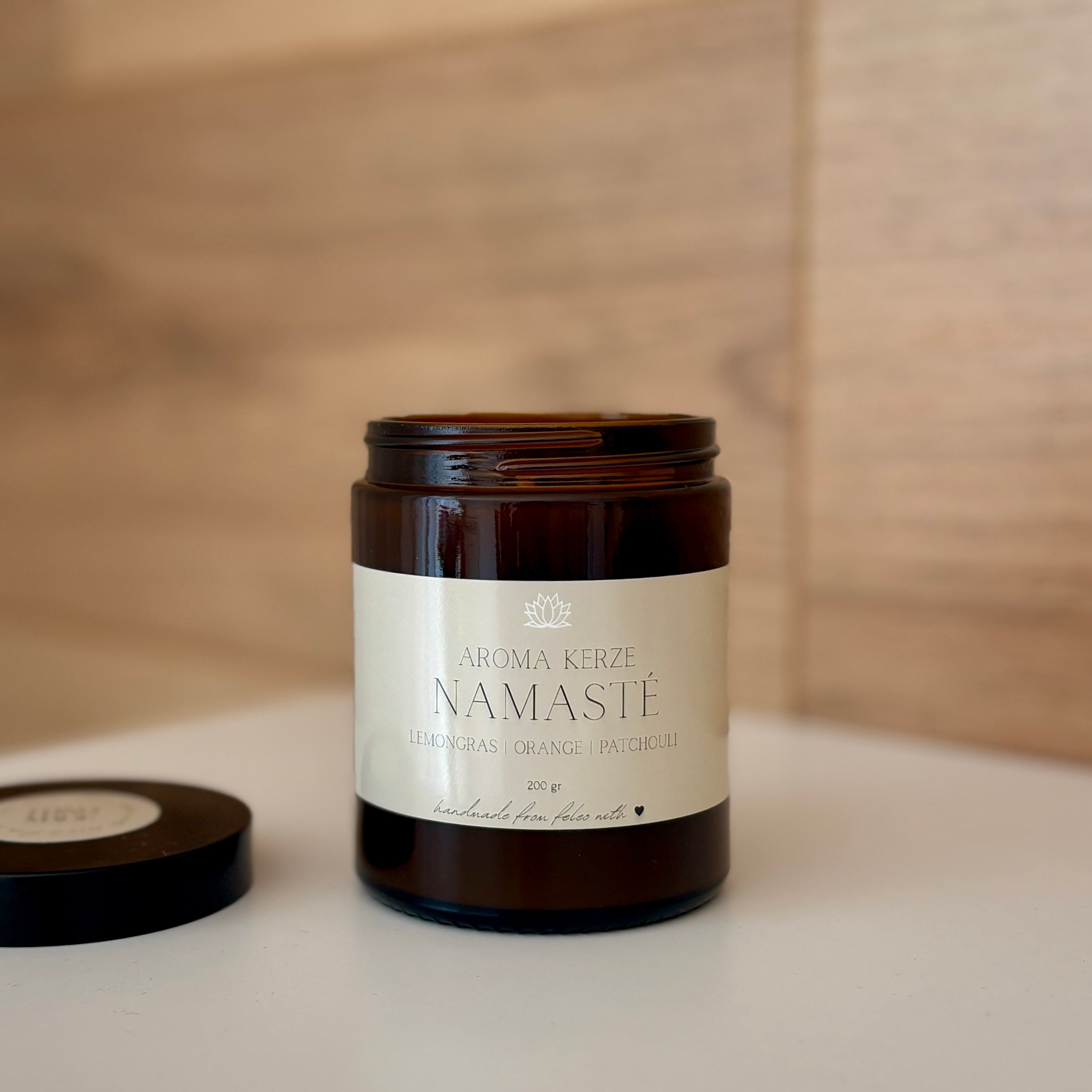 Unsere handgefertigte Aromakerze aus 150 g natürlichem Sojawachs und Bio-ätherischen Ölen lädt zum Entspannen, Wohlfühlen und Energie tanken ein.